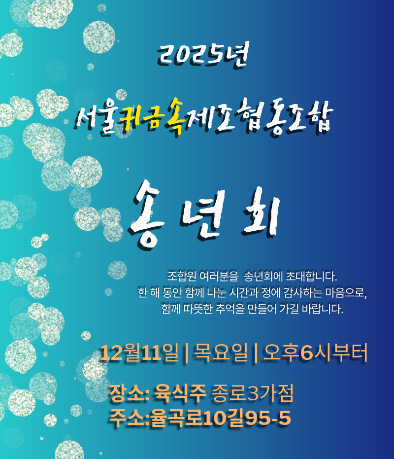 서울귀금속제조협동조합 소식바구니 서울귀금속제조협동조합 소식바구니 공지사항 이곳은 귀금속 관련 업계 소식을 알 수 있는 공간입니다. 정부공공기관의 정책공지와 업계공지 등 협동조합회원이라면 꼭 챙겨야 할 이야기를 확인하실 수 있습니다. 서울귀금속제조협동조합 2025년 송년회 작성자 제조조합사무국 작성일 2025-12-08 10:14 조회 32 =2025년 제조협동조합 송년회 알림== 2025년 한 해 동안 조합의 발전을 위해 애써주신 조합원 여러분께 감사드리며, 다가오는 새해를 함께 맞이하는 송년의 자리에 조합원님들을 초대합니다. 바쁘시겠지만 많이 참석해주시길 부탁드립니다. 일정: 2025년 12월11일(목요일) 6시부터. 장소: 육식주 종로3가점. 좋아요 0 싫어요 0 인쇄 « 공지사항 테스트입니다~ 목록보기 답글쓰기 글수정 글삭제 Powered by KBoard